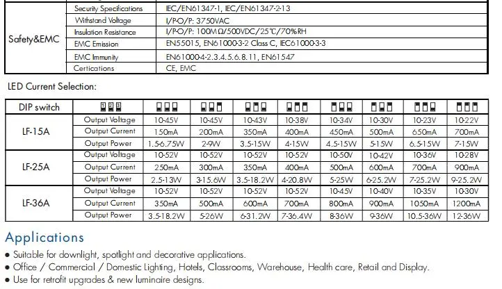 خود کار طریقے سے وولٹیج کی تعمیل: ڈرائیور خود بخود اپنے آؤٹ پٹ وولٹیج کو ایڈجسٹ کرتا ہے تاکہ منسلک ایل ای ڈی بوجھ کی فارورڈ وولٹیج کی ضرورت کو اپنی مخصوص حد (جیسے ، 12-24VDC ، 20-40VDC) کے اندر مل جائے۔