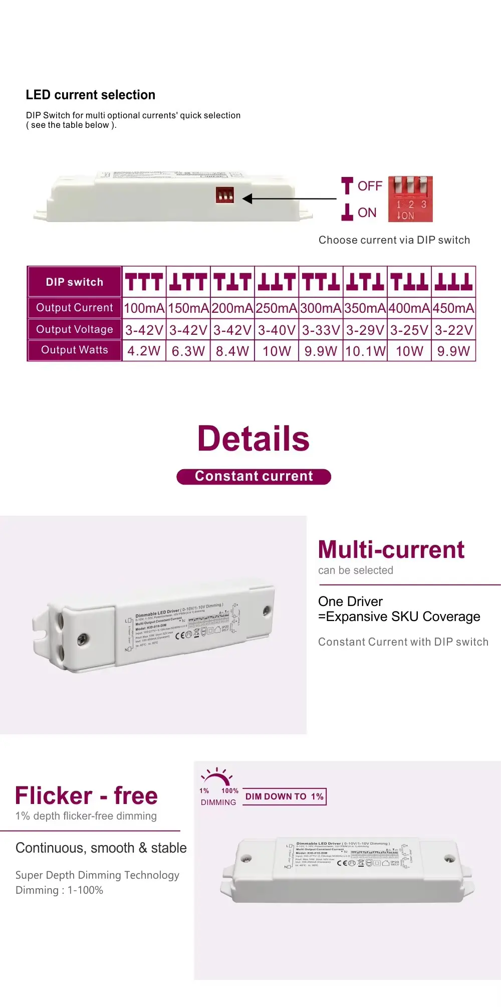 مستقل کارکردگی کی فراہمی کے لئے بنایا گیا ، یہ ڈیمر وسیع 3-42V ڈی سی آؤٹ پٹ کی حمایت کرتا ہے ، جس سے یہ عام کم وولٹیج ایل ای ڈی ماڈیولز اور سٹرپس کی وسیع رینج کے ساتھ مطابقت رکھتا ہے۔ اس کی وسیع رینج ان پٹ وولٹیج قبولیت مختلف برقی ماحول میں مستحکم آپریشن کو یقینی بناتی ہے۔ 10W سے 60W تک بوجھ ڈرائیونگ کرنے کے قابل ، یہ گھروں میں لہجے کی روشنی ، کوز ، اور گھروں میں انڈر کابینیٹ ٹاسک لائٹنگ سے لے کر ، ہوٹلوں ، ریستوراں اور دفاتر میں زیادہ محیطی روشنی کی روشنی کے لئے بالکل مناسب ہے۔