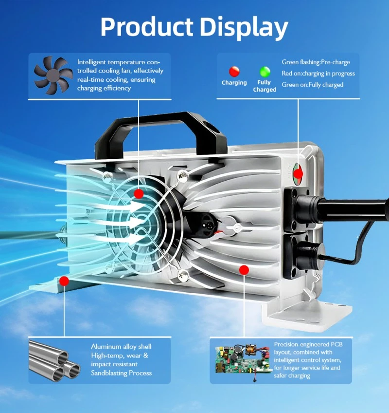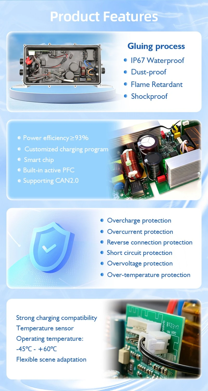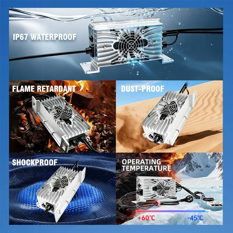 مکمل ایلومینیم الائے شیل گرمی کی کھپت کی کارکردگی کو پلاسٹک کے گولوں کے مقابلے میں 35 فیصد بڑھاتا ہے، چارجر کے آپریٹنگ درجہ حرارت کو مسلسل 1.2kW آپریشن کے دوران 60℃ سے نیچے رکھتا ہے، اس طرح اندرونی اجزاء کی حفاظت کرتا ہے اور سروس کی زندگی کو بڑھاتا ہے۔ مزید برآں، یہ ملٹی لیئر سیفٹی پروٹیکشن میکانزم سے لیس ہے، بشمول اوور وولٹیج پروٹیکشن (55V میکس)، اوور کرنٹ پروٹیکشن (28A میکس)، شارٹ سرکٹ پروٹیکشن، اور زیادہ ٹمپریچر پروٹیکشن، مؤثر طریقے سے چارجر اور بیٹری کو پہنچنے والے نقصان کو روکنا، اور تمام آن بورڈ ماحول میں محفوظ آپریشن کو یقینی بنانا۔