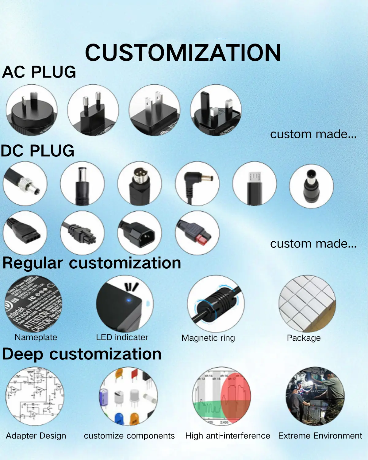 ہم AC/DC بجلی کی فراہمی کی فیکٹری ہیں جو کسی بھی پاور اڈاپٹر کو اپنی مرضی کے مطابق بناسکتے ہیں اور متعلقہ سرٹیفیکیشن پاس کرسکتے ہیں۔