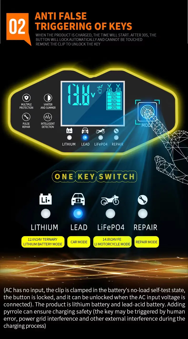 1. سمارٹ اور ہم آہنگ ZYX-J40 مارکیٹ میں تقریباً ہر قسم کی بیٹری کو سپورٹ کرتا ہے، بشمول لیڈ ایسڈ، AGM، جیل، EFB، Li-ion، اور LiFePO₄ (لتیم آئرن فاسفیٹ)۔ 2Ah سے 150Ah کی وسیع گنجائش کے ساتھ، یہ موٹرسائیکل کی چھوٹی بیٹریوں سے لے کر بڑی کار کی بیٹریوں تک ہر چیز کو سنبھالتی ہے۔