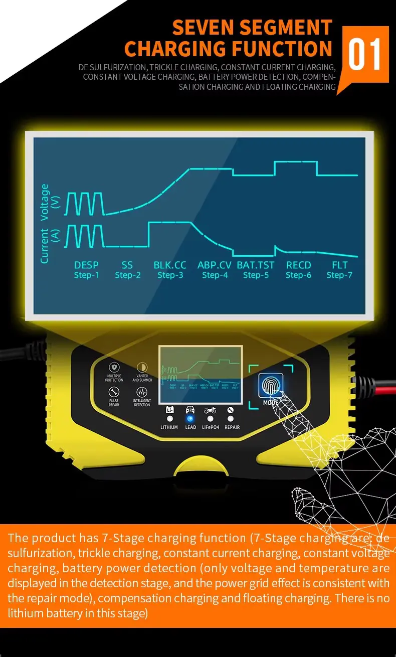 7-اسٹیج آٹومیٹک چارجنگ: یہ ایک مکمل خودکار بیٹری چارجر ہے جس میں 7 چارج مراحل ہیں۔