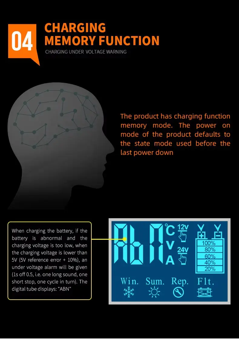 2. آپٹمائزڈ چارجنگ پرفارمنس یہ چارجر 6A پر 12V اور 3A پر 24V فراہم کرتا ہے، جس کی زیادہ سے زیادہ آؤٹ پٹ 110W اور 85% چارجنگ کی کارکردگی پورے بوجھ میں ہے۔ خودکار 7-اسٹیج سمارٹ چارجنگ پروگرام میں ڈیسلفیشن، سافٹ اسٹارٹ، بلک چارجنگ، جذب، تجزیہ، ری کنڈیشننگ، اور فلوٹ مینٹیننس شامل ہیں۔ ایک سرشار سرمائی موڈ سرد درجہ حرارت میں محفوظ چارجنگ کو یقینی بناتا ہے، جبکہ LCD ڈسپلے آپ کو چارج وولٹیج، کرنٹ، اور بیٹری کے درجہ حرارت کو حقیقی وقت میں مانیٹر کرنے دیتا ہے۔
