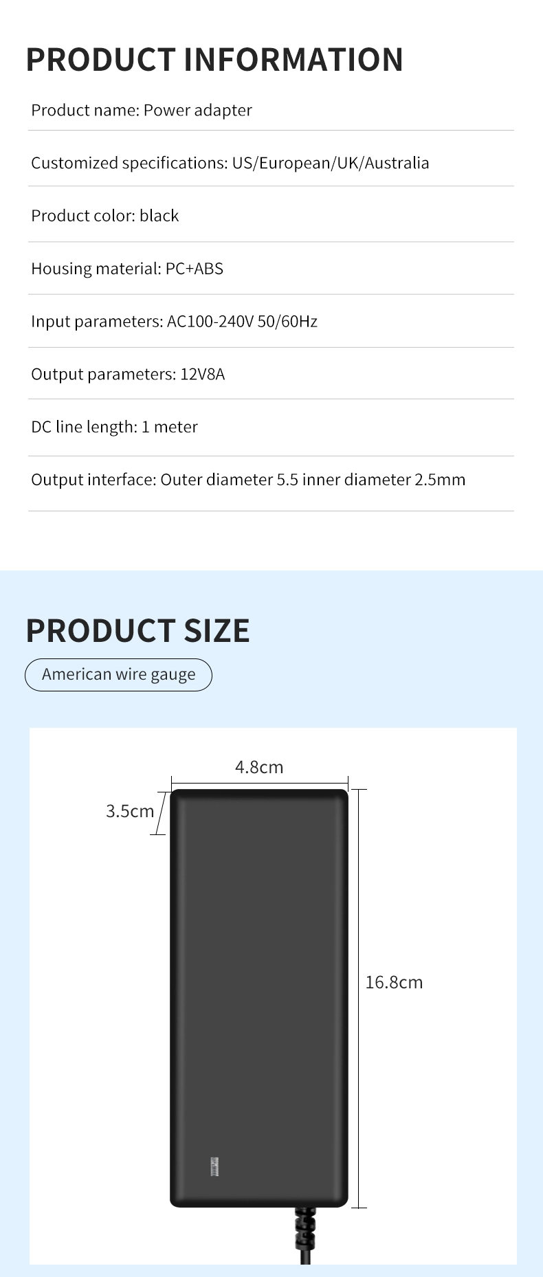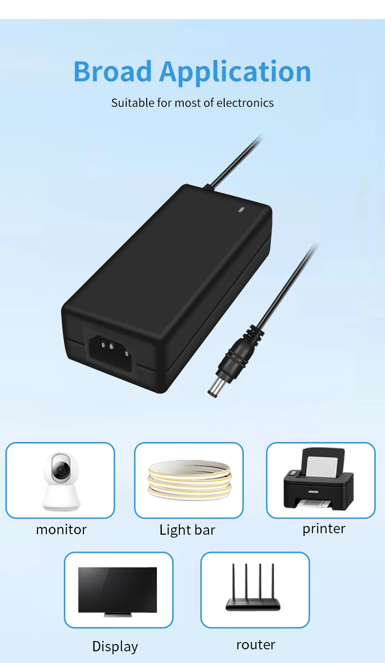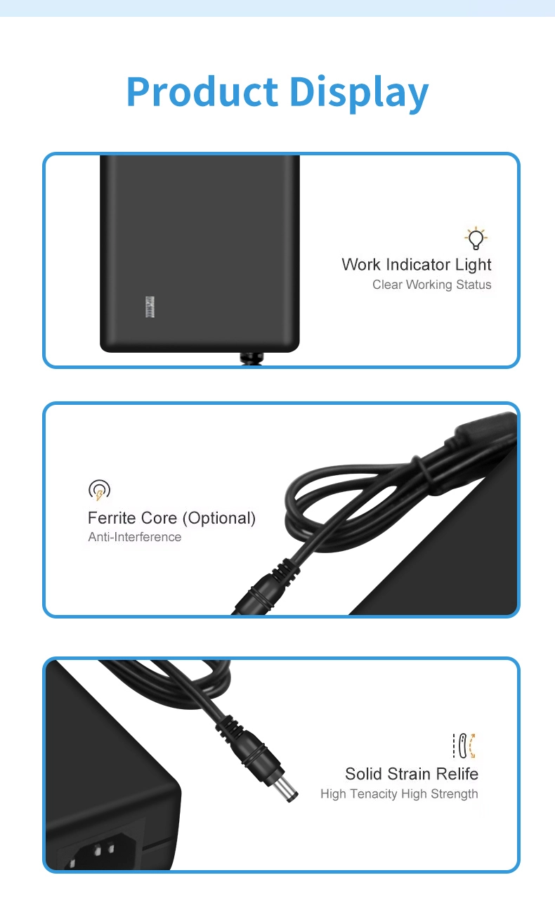 AC 100-240V وسیع وولٹیج ان پٹ دنیا بھر میں 100 سے زیادہ ممالک میں پاور گرڈ کے ساتھ مطابقت رکھتا ہے۔ 1.5 میٹر توسیع شدہ آؤٹ پٹ کیبل (1.0 ملی میٹر قطر) 180 ° گھومنے والی ڈی سی کنیکٹر کے ساتھ جوڑ بنا ہوا مختلف تنصیب کے منظرناموں کے مطابق۔ صرف 120 × 60 × 30 ملی میٹر کے کمپیکٹ سائز کے ساتھ ، یہ ایک ہی طاقت کے روایتی اڈیپٹر سے 35 ٪ چھوٹا ہے ، جس کا وزن صرف 280 گرام ہے - جس میں 50 ٪ تک پورٹیبلٹی کو بہتر بنانا ہے۔