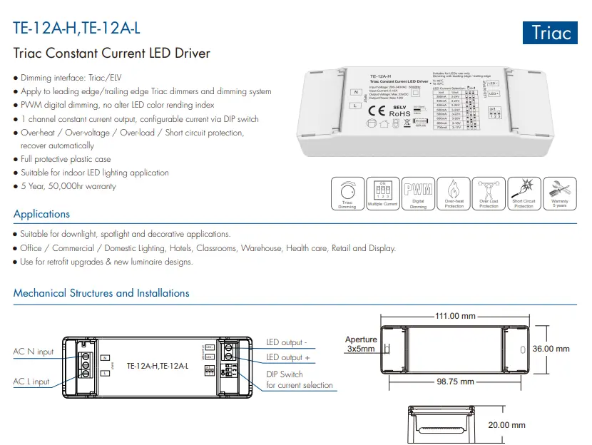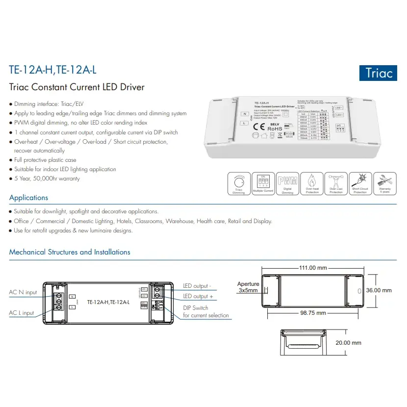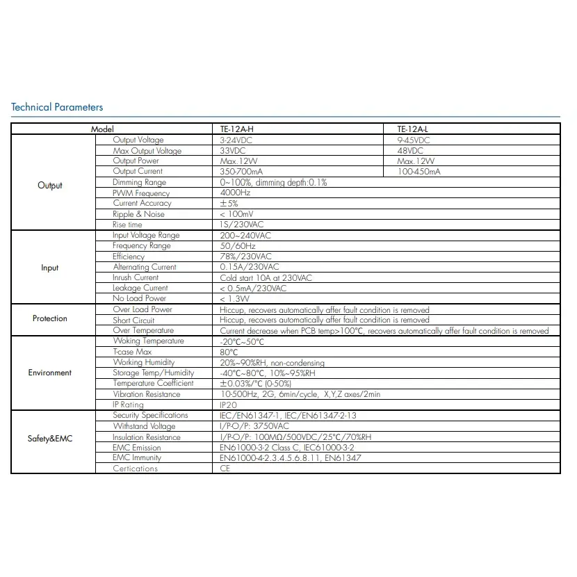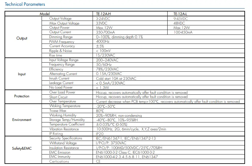 ان پٹ وولٹیج: 200-240VAC 50-60Hz ان پٹ موجودہ: 0.15a آؤٹ پٹ پاور: 12 واٹ زیادہ سے زیادہ آؤٹ پٹ وولٹیج: 9 ~ 42V وارنٹی: 2 سال سرٹیفکیٹ: سی ای/آر او ایچ ایس