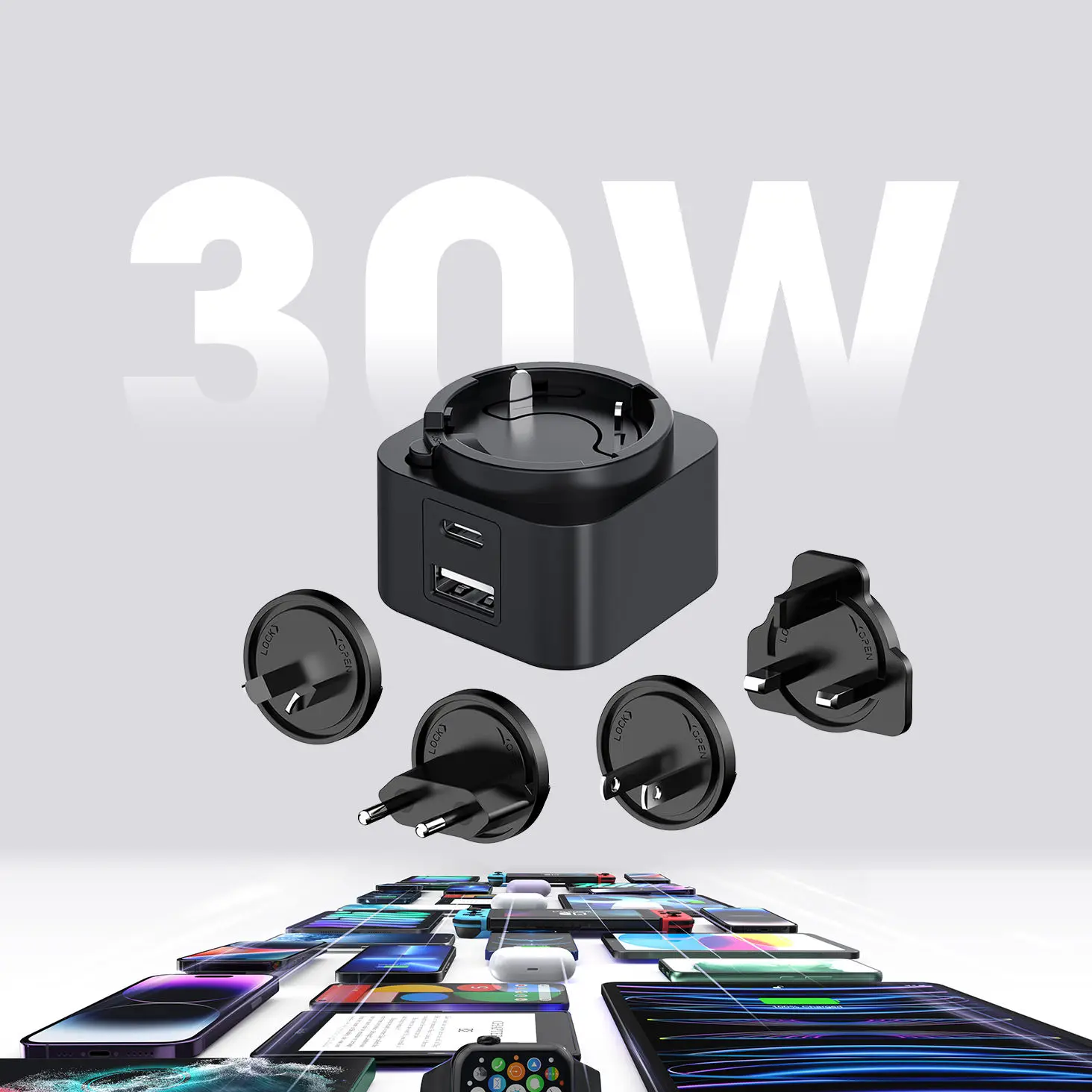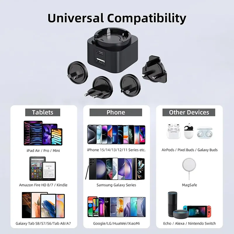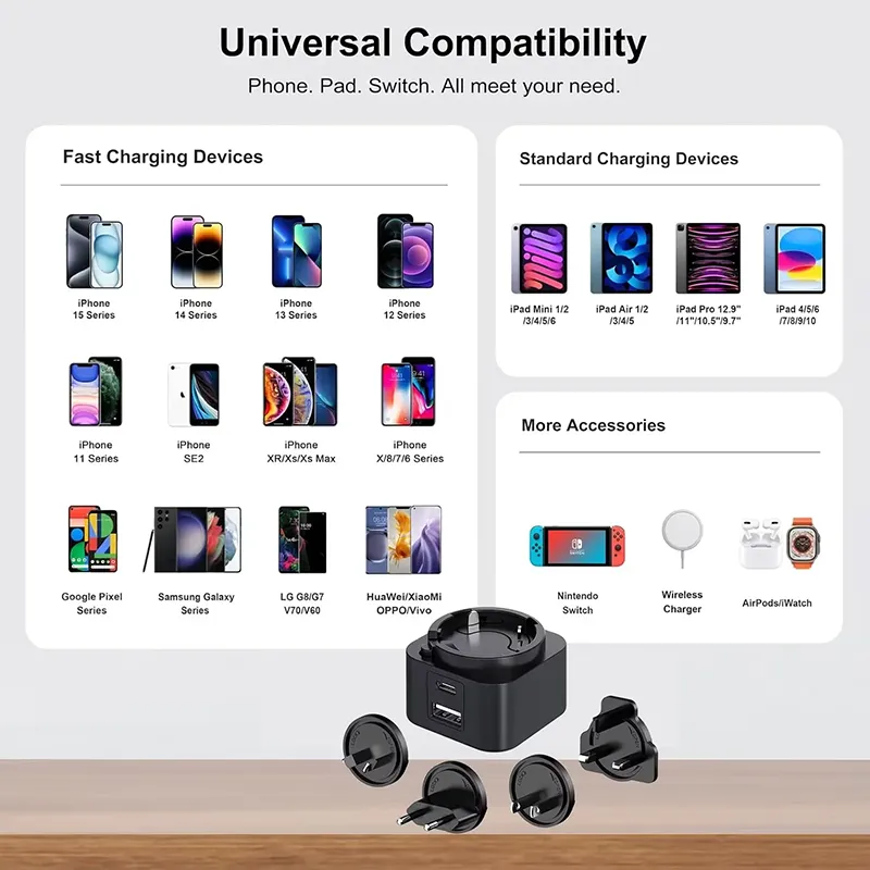 استرتا کلید ہے۔ ڈوئل پورٹ ڈیزائن (USB-C/USB-A) آپ کو بیک وقت دو آلات چارج کرنے کی اجازت دیتا ہے۔ 30W تبادلہ پلگ PD چارجر میں تبادلہ کرنے والے پلگ (US/EU/UK/AU) کا ایک سیٹ شامل ہے ، جس سے یہ پوری دنیا میں آپ کا کامل سفری ساتھی بن جاتا ہے۔ چاہے آپ اسمارٹ فون ، ٹیبلٹ ، یا لیپ ٹاپ چارج کر رہے ہو ، آفاقی مطابقت اعلی درجے کی کارکردگی کو یقینی بناتی ہے۔