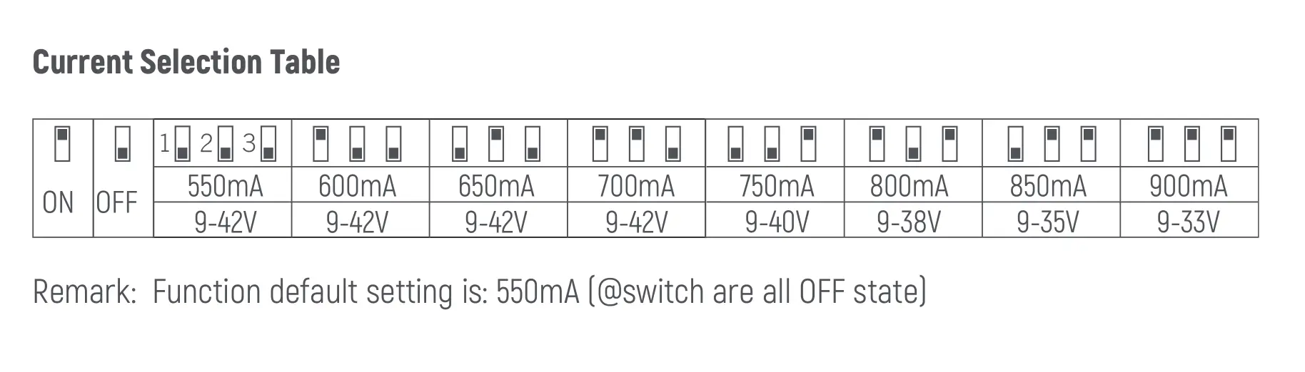 آؤٹ پٹ موجودہ: ایڈجسٹ ، تفصیلات کے لئے موجودہ سلیکشن ٹیبل دیکھیں