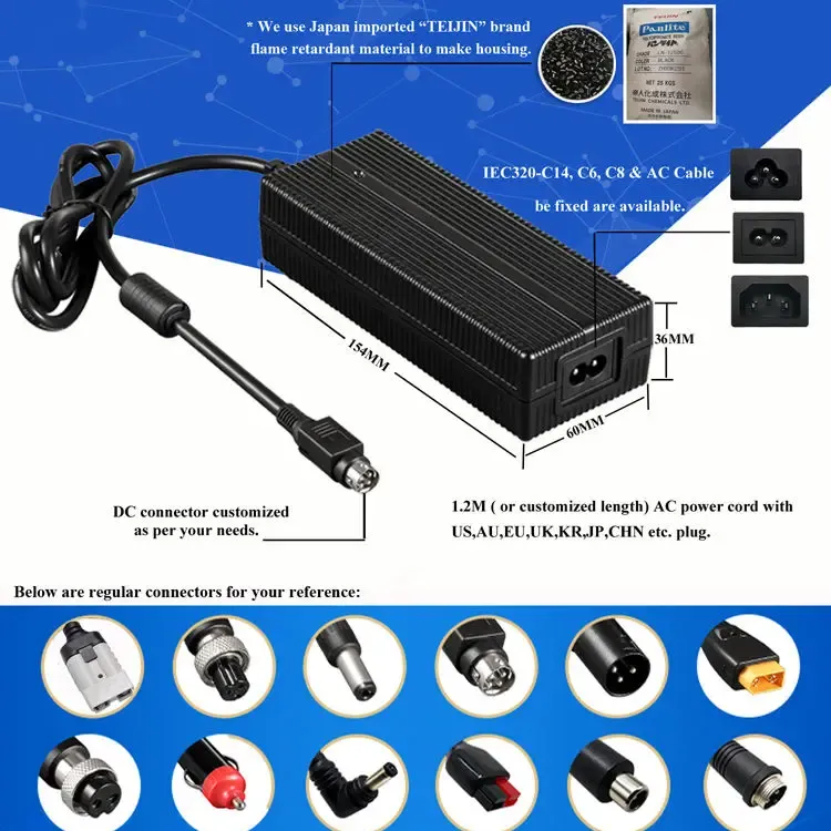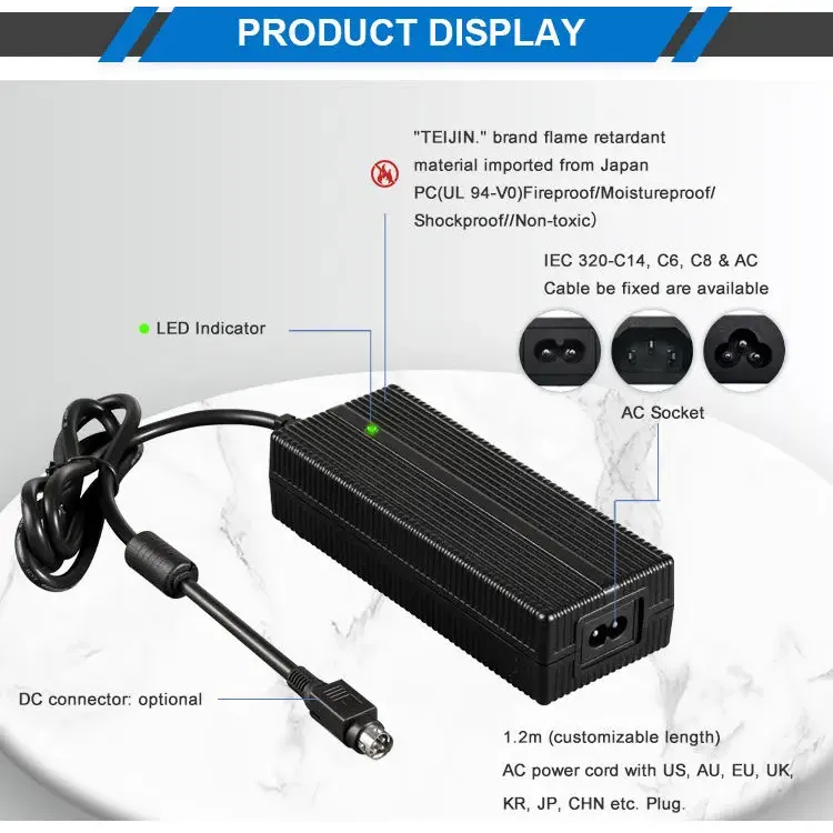 عالمی مطابقت اور لچکدار ڈیزائن: 100–240VAC، 50/60Hz کی یونیورسل AC ان پٹ رینج کے ساتھ بنایا گیا، یہ چارجر دنیا بھر میں استعمال کی حمایت کرتا ہے۔ یہ ایک سے زیادہ AC inlet کے اختیارات پیش کرتا ہے (IEC320-C14, C6, C8) اور ایک 1.2M پاور کورڈ کے ساتھ آتا ہے جسے US, AU, EU, UK, KR, JP, CHN اور دیگر علاقائی پلگ کے ساتھ اپنی مرضی کے مطابق بنایا جا سکتا ہے۔ ہاؤسنگ پی سی فائر پروف مواد سے تعمیر کی گئی ہے، جو مختلف آپریٹنگ حالات میں پائیداری اور حفاظت کو یقینی بناتی ہے۔