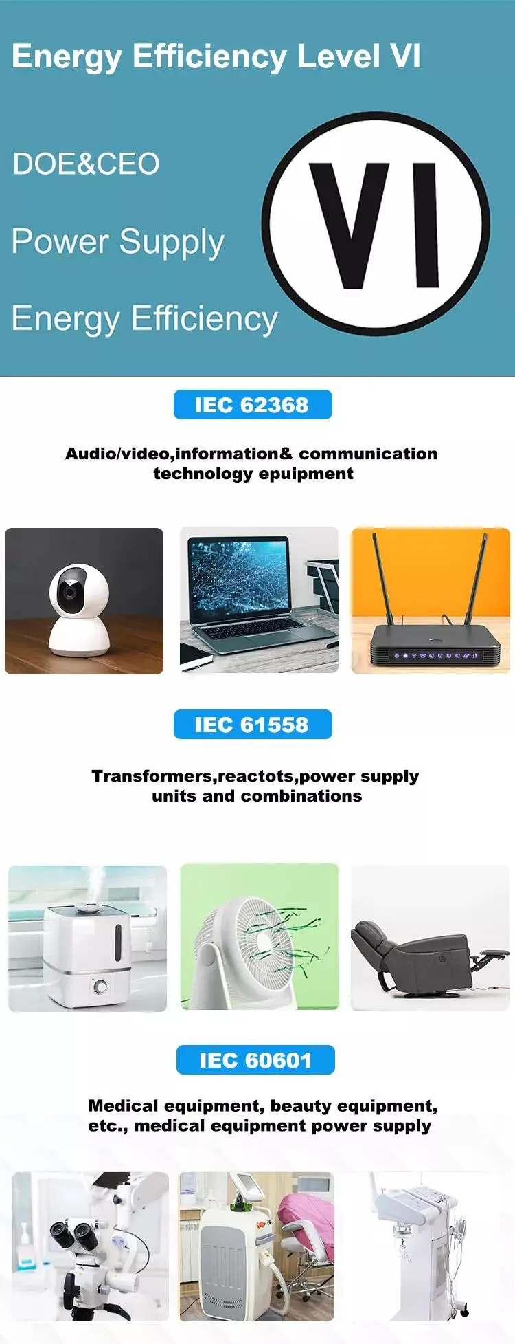 IEC62368 صارفین کے الیکٹرانکس کے لئے ، بیٹری چارجر کے لئے IEC60335 ، میڈیکل گریڈ کے سازوسامان کے لئے IEC60601 ، گھریلو درخواست کے لئے IEC61558 ، ایل ای ڈی لائٹنگ کے لئے IEC61347۔ |