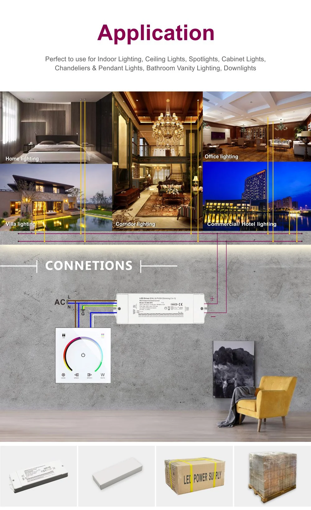 چاہے وہ دفاتر میں ایل ای ڈی پینل لائٹس ہوں، شاپنگ مالز میں ایل ای ڈی ڈاؤن لائٹس، ہوٹل کی راہداریوں میں چھپی ہوئی لائٹ سٹرپس، یا گھر کی جگہوں پر لہجے کی روشنی، یہ ڈرائیور بہترین انتخاب ہے۔ مکمل پوٹنگ کے ساتھ کمپیکٹ ایلومینیم الائے ہاؤسنگ بہترین گرمی کے انتظام اور طویل مدتی مستحکم آپریشن کو یقینی بناتا ہے۔ اوور وولٹیج، اوور کرنٹ، شارٹ سرکٹ اور اوور ہیٹ کے لیے بلٹ ان متعدد تحفظاتی سرکٹس پورے لائٹنگ سسٹم کے لیے جامع حفاظتی تحفظ فراہم کرتے ہیں۔