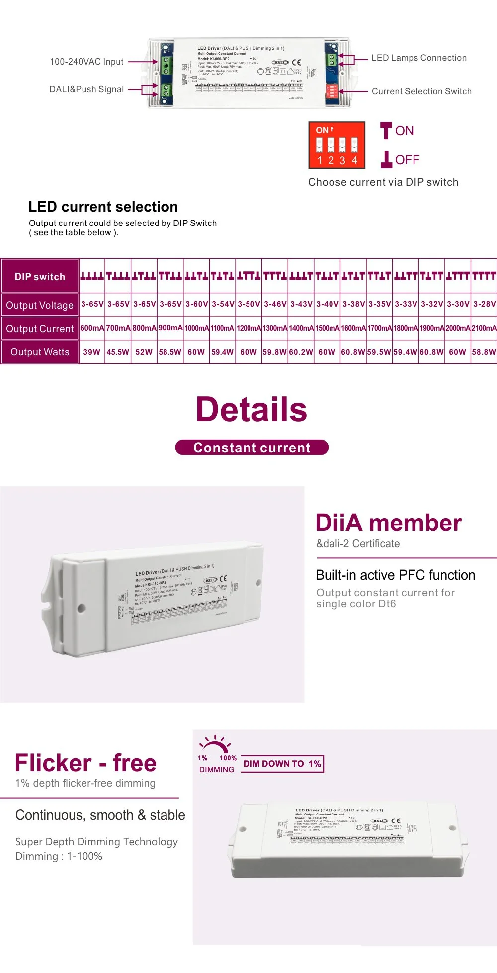 60W مسلسل موجودہ ڈالی dimming CCT قیادت ڈرائیور |