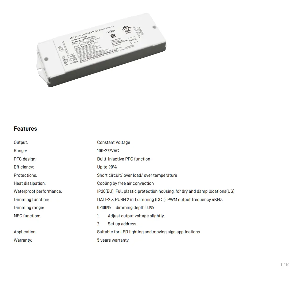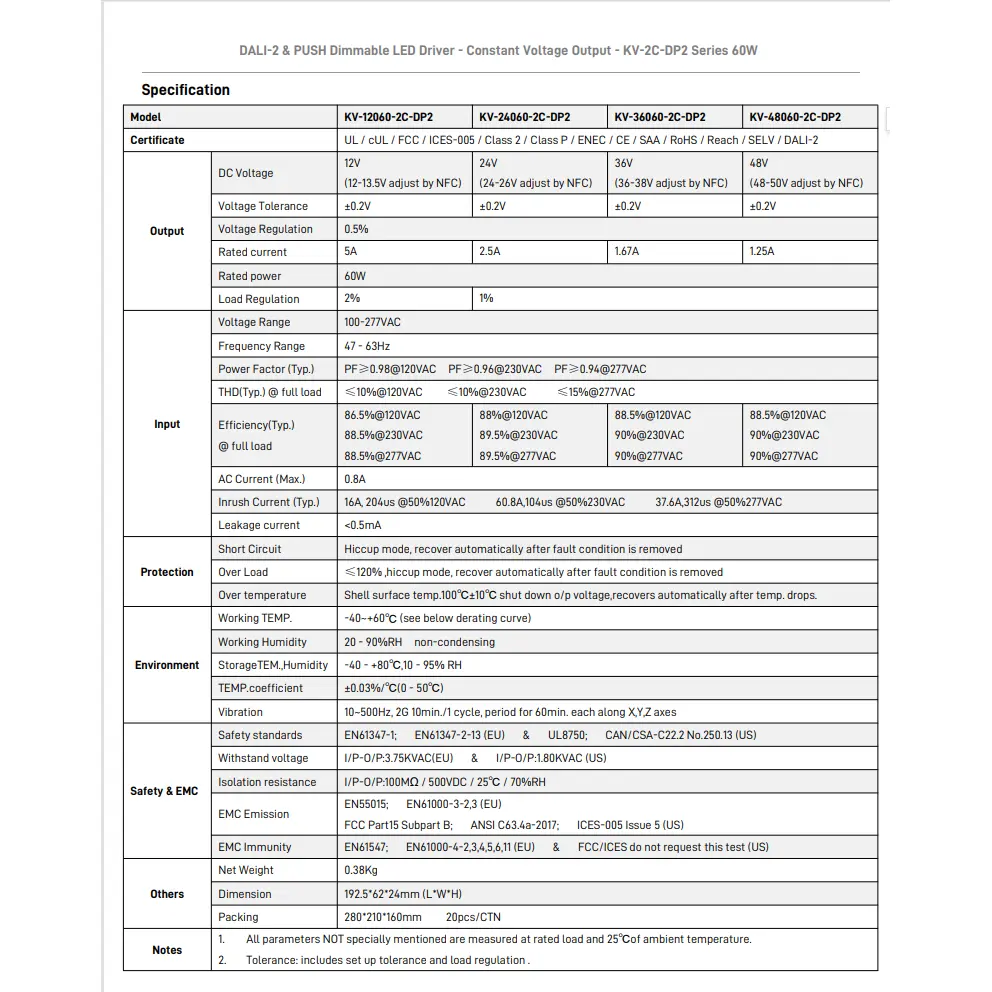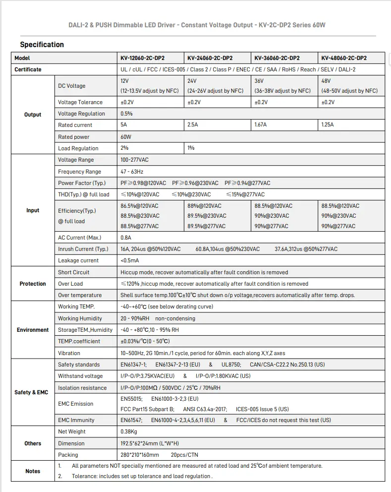 UL/cUL/FCC/ICES-005/Class 2/Class P/ENEC/CE/SAA/RoHS/Reach/SELV/DALI-2 |