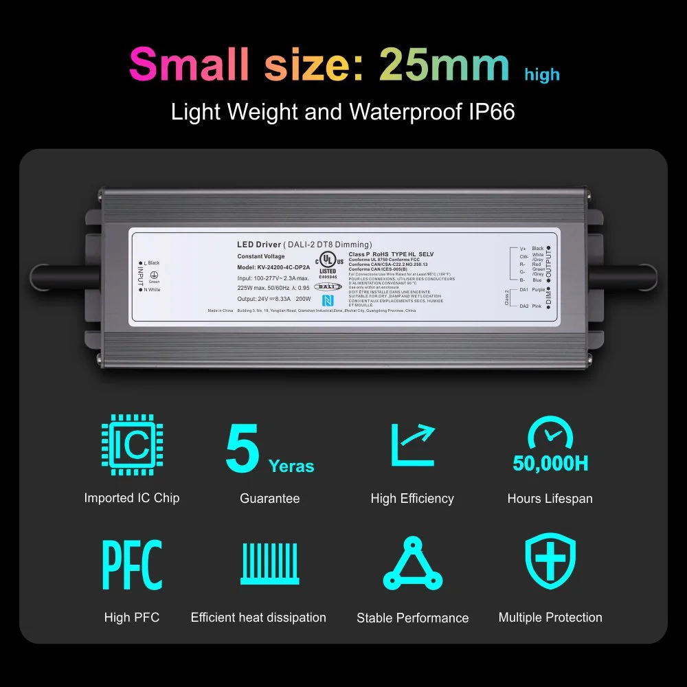 یہ پروڈکٹ ایک DALI Constant Voltage 200W CCT Dimmable LED ڈرائیور ہے، جو اعلیٰ درجے کے تجارتی اور سمارٹ ہوم لائٹنگ کنٹرول کے لیے ایک جدید حل کی نمائندگی کرتا ہے۔ DALI 2 DT8 Dimmable 200W LED ڈرائیور کے معیار کے ساتھ مکمل طور پر مطابقت رکھنے والے بنیادی جزو کے طور پر، یہ نہ صرف ہموار اور بغیر قدم کے برائٹنس ایڈجسٹمنٹ کو قابل بناتا ہے بلکہ DT8 توسیعی پروٹوکول کے ذریعے، رنگین درجہ حرارت (CCT) اور یہاں تک کہ رنگ (RGB) روشنی کا درست اور ڈیجیٹل انتظام بھی پیش کرتا ہے، جس سے ڈیزائنرز کو ناقابل یقین روشنی اور روشنی کی تخلیق فراہم کی جاتی ہے۔