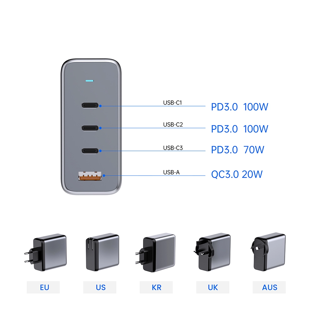 C1/C2 آؤٹ پٹ : 5V3A ، 9V3A ، 12V3A ، 15V3A ، 20V5A ، پی پی ایس: 3.3-20V5A (100W زیادہ سے زیادہ) C3 آؤٹ پٹ : 5V3A ، 9V3A ، 12V3A ، 15V3A ، 20V3.5A ، (70W میکس) پی پی ایس: 3.3-11V5A USB-A آؤٹ پٹ: 5V3A ، 9V2A ، 12V1.67A ، SCP: 3.3-11V2A (22W میکس) C1+C2/C1+C3 آؤٹ پٹ: 70W+30W C1+C2+(C3+USB-A) آؤٹ پٹ: 40W+40W+15W کل : 100W |