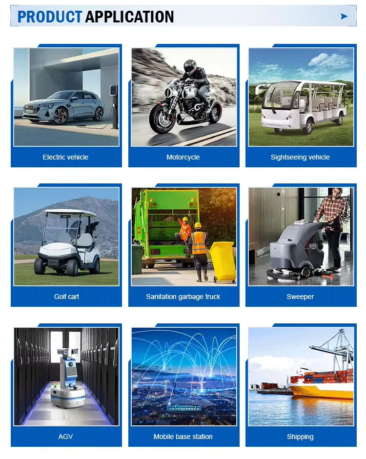 استعمال: موٹرسائیکل/سکوٹر، ٹرائی سائیکل، کرپر، سویپر، فورک لفٹ، ٹرک، الیکٹرک بس، لیڈ ایسڈ بیٹری، الیکٹرک گاڑی، سیر کرنے والی گاڑی، لاجسٹکس گاڑی، صفائی کی گاڑی، گشت کار، ڈیون بگیز، جہاز، مواصلاتی سامان