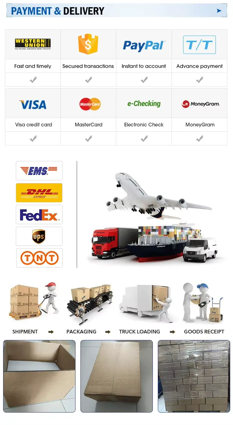 A4: چھوٹے آرڈرز ایکسپریس کے ذریعے بھیجے جاتے ہیں (FEDEX، DHL، EMS، TNT)۔ سمندر یا ہوا کے ذریعے بڑے آرڈرز بھیجے جاتے ہیں۔ FOB قیمت دستیاب ہے۔ آپ اپنا فارورڈر یا ہمارا استعمال کر سکتے ہیں۔