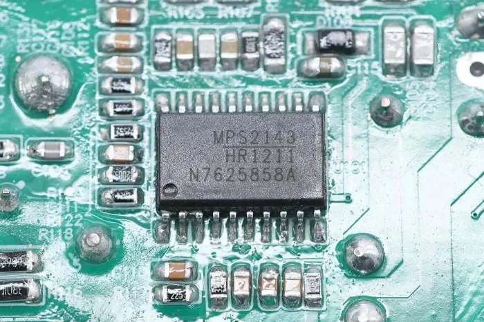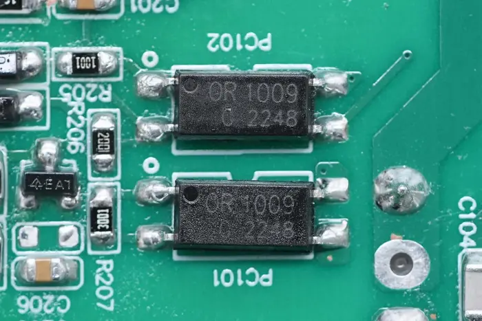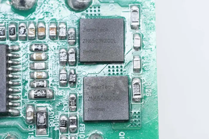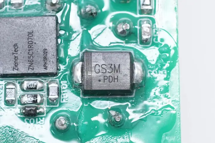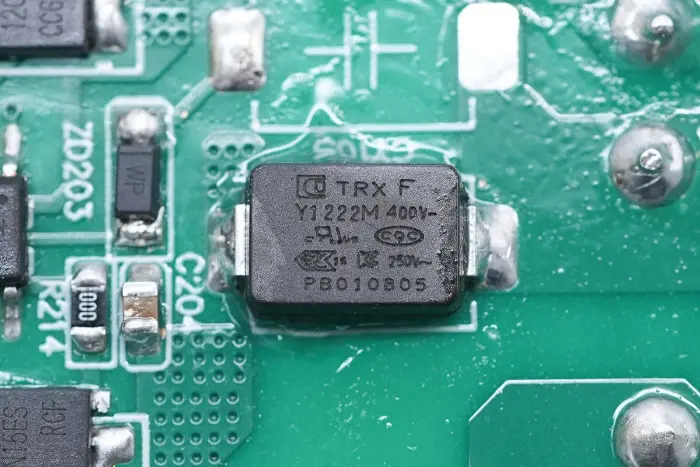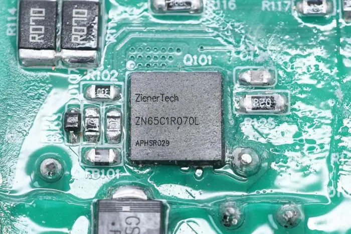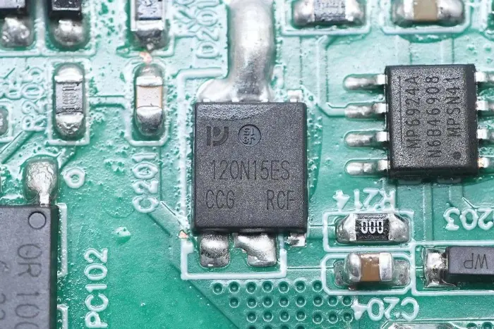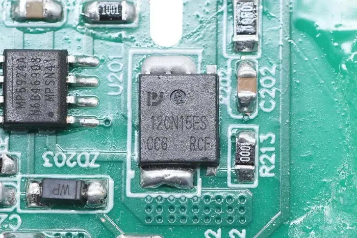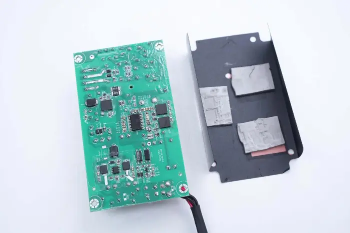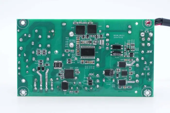 PCBA ماڈیول کے پیچھے، ایک 2-in-1 PFC+LLC کنٹرولر ہے۔ PFC سوئچ نیچے بائیں طرف واقع ہے، LLC سوئچ مین کنٹرول چپ کے اوپر ہے، فیڈ بیک آپٹکوپلر دائیں طرف ہے، اور سنکرونس ریکٹیفائر کنٹرولر اور دو سنکرونس ریکٹیفائر نیچے ہیں۔ پورے بورڈ کو تحفظ کے لیے کنفارمل کوٹنگ کے ساتھ لیپت کیا گیا ہے۔
