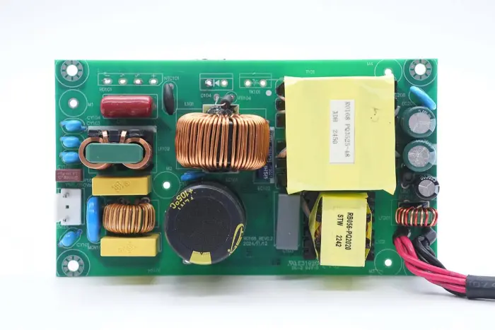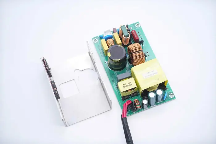 PCBA ماڈیول کے سامنے کا جائزہ: بائیں طرف پاور ان پٹ ساکٹ، فیوز، Y capacitor، varistor، کامن موڈ انڈکٹر، اور حفاظت X2 capacitor سے لیس ہے۔ درمیانی پوزیشن پی ایف سی بوسٹ انڈکٹر اور ہائی وولٹیج فلٹر کیپسیٹر سے لیس ہے۔ دائیں طرف ایل ایل سی ریزوننٹ کیپسیٹر، ریزوننٹ انڈکٹر، ٹرانسفارمر، فلٹر کیپسیٹر، اور فلٹر انڈکٹر سے لیس ہے۔