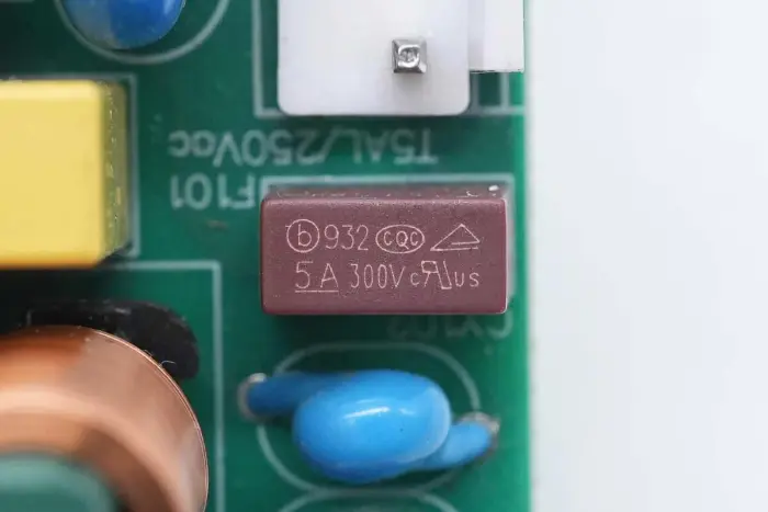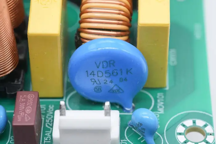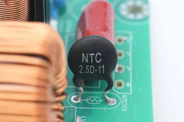 NTC تھرمسٹر کو 2.5D-11 نشان زد کیا گیا ہے، جو ہائی وولٹیج الیکٹرولائٹک کپیسیٹر کے چارجنگ کرنٹ کو دبانے کے لیے استعمال ہوتا ہے۔