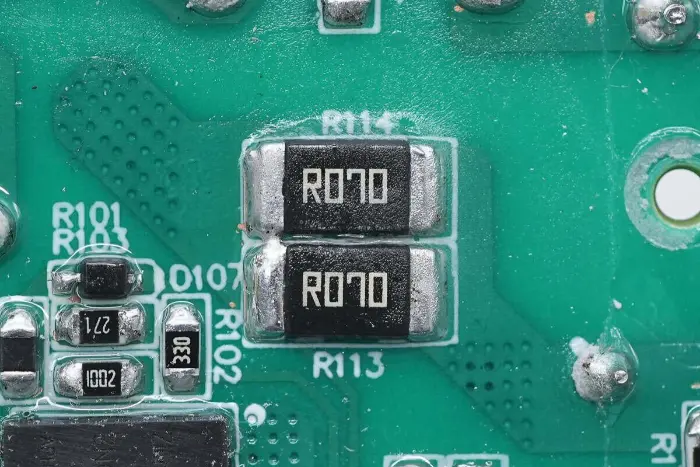 دو 70mΩ ریزسٹرس متوازی طور پر سوئچ کرنٹ کا پتہ لگانے کے لیے جڑے ہوئے ہیں۔