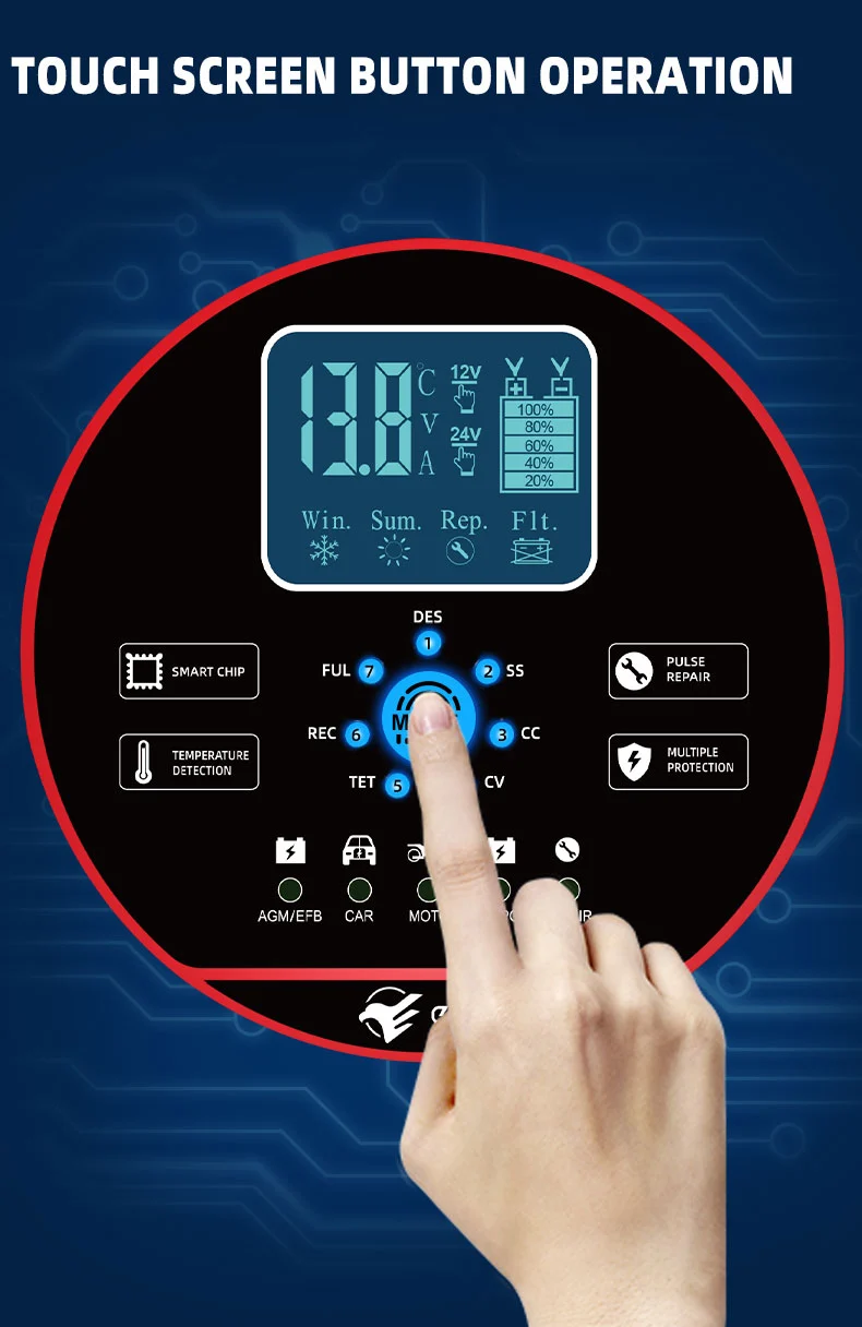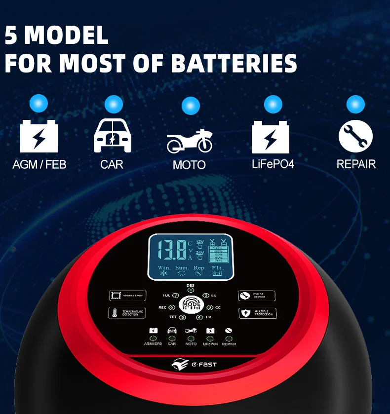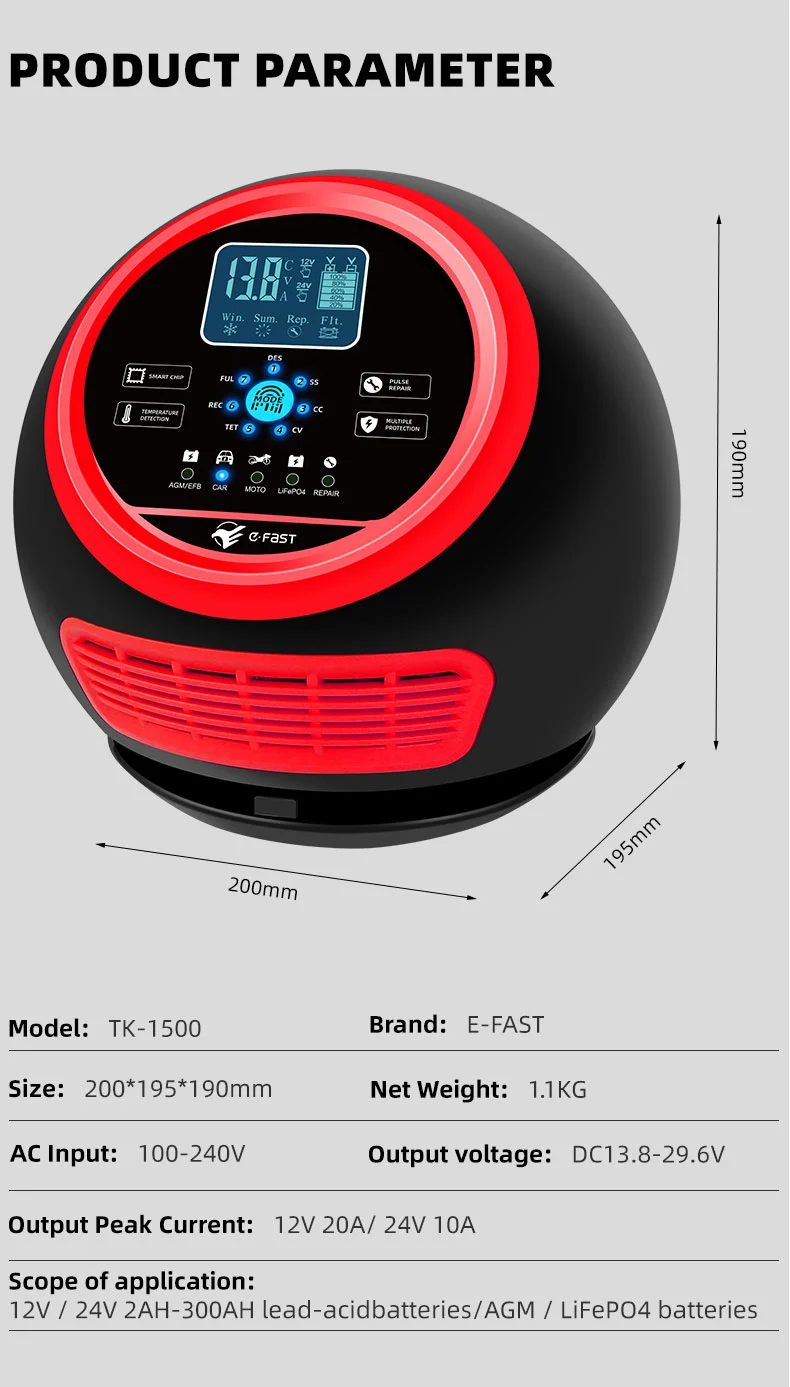 یہ چارجر ایک جدید کمپیکٹ ڈیزائن کی خصوصیات رکھتا ہے اور ایک ہائی ڈیفینیشن LCD ڈسپلے سے لیس ہے جو وولٹیج، کرنٹ، درجہ حرارت، چارجنگ کی پیشرفت اور بیٹری کی حالت کو حقیقی وقت میں ظاہر کرتا ہے، جس سے آپریشن ایک نظر میں واضح ہوتا ہے۔ اس میں پلس کی مرمت کا فنکشن ہے جو پرانی بیٹریوں کو چالو اور مرمت کر سکتا ہے، ان کی عمر کو بڑھا سکتا ہے۔ مکمل طور پر خودکار ذہین چارجر کے طور پر، TK-1500 "پلگ اینڈ بھولو" آپریشن کو سپورٹ کرتا ہے: یہ خود بخود بیٹری وولٹیج کا پتہ لگاتا ہے، چارجنگ موڈ کا انتخاب کرتا ہے، اور اوور چارجنگ کو روکنے کے لیے فل چارجنگ کے بعد فلوٹ چارجنگ مینٹیننس موڈ پر سوئچ کرتا ہے۔ یہ گاڑیوں کی بیٹری کی دیکھ بھال کے لیے مثالی ہے جو لمبے عرصے کے لیے کھڑی ہوتی ہیں یا موسمی آلات جیسے لان کاٹنے والی مشینیں اور کشتیاں۔